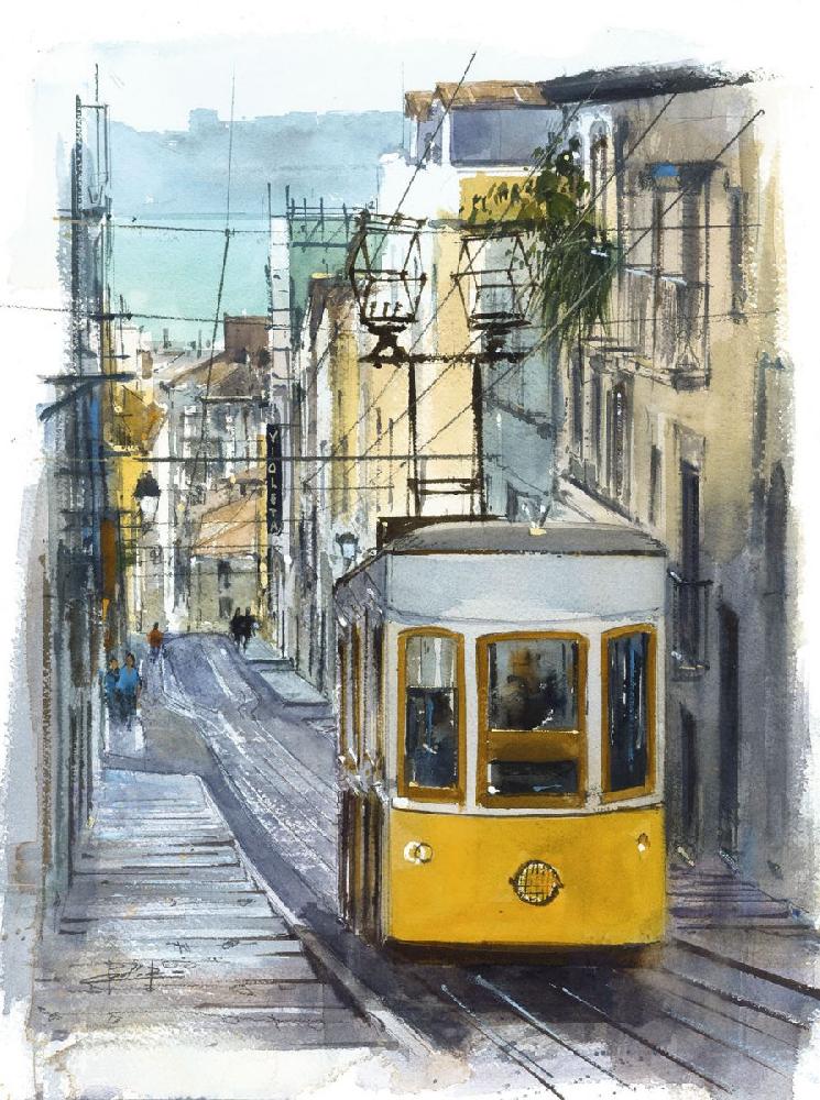 Las acuarelas de Lisboa de Pablo Rubén invitan a tener todos los sueños del mundo. Invitan a llegar o a partir hacia otros destinos oníricos desde las estaciones de Santa Apolónia, Rossio y Oriente; a perderse sin rumbo explorando el dédalo de callejuelas de Alfama y Mouraria, que tan bien retrata al pintar, por ejemplo, el Beco da Surra; a admirar la inmensidad proporcionada por las alturas de las siete colinas y de miradores como los de Graça, Senhora do Monte y el Parque Eduardo VII al atardecer; a atravesar con el ferri el estuario ante la imponente presencia del puente 25 de Abril; a desplazarse enlatados como sardinas en funiculares como los de Glória y Bica, o en tranvías tan emblemáticos como el 28; a visitar tiendas y cafés con historia, mercados y mercadillos como la Feira da Ladra; a saborear los suculentos platos de su gastronomía; a anestesiarse los oídos con el fado, Patrimonio Inmaterial de la Humanidad.